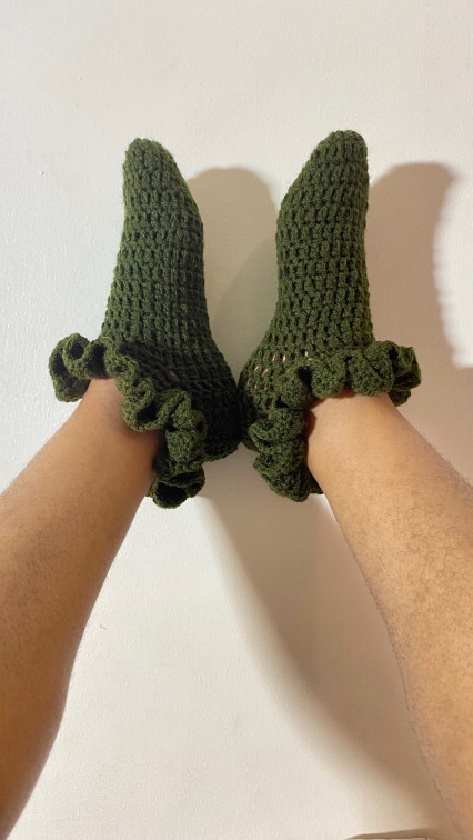 CROTCHET RUFFLE ANKLE SOCKS IN ARMY GREEN